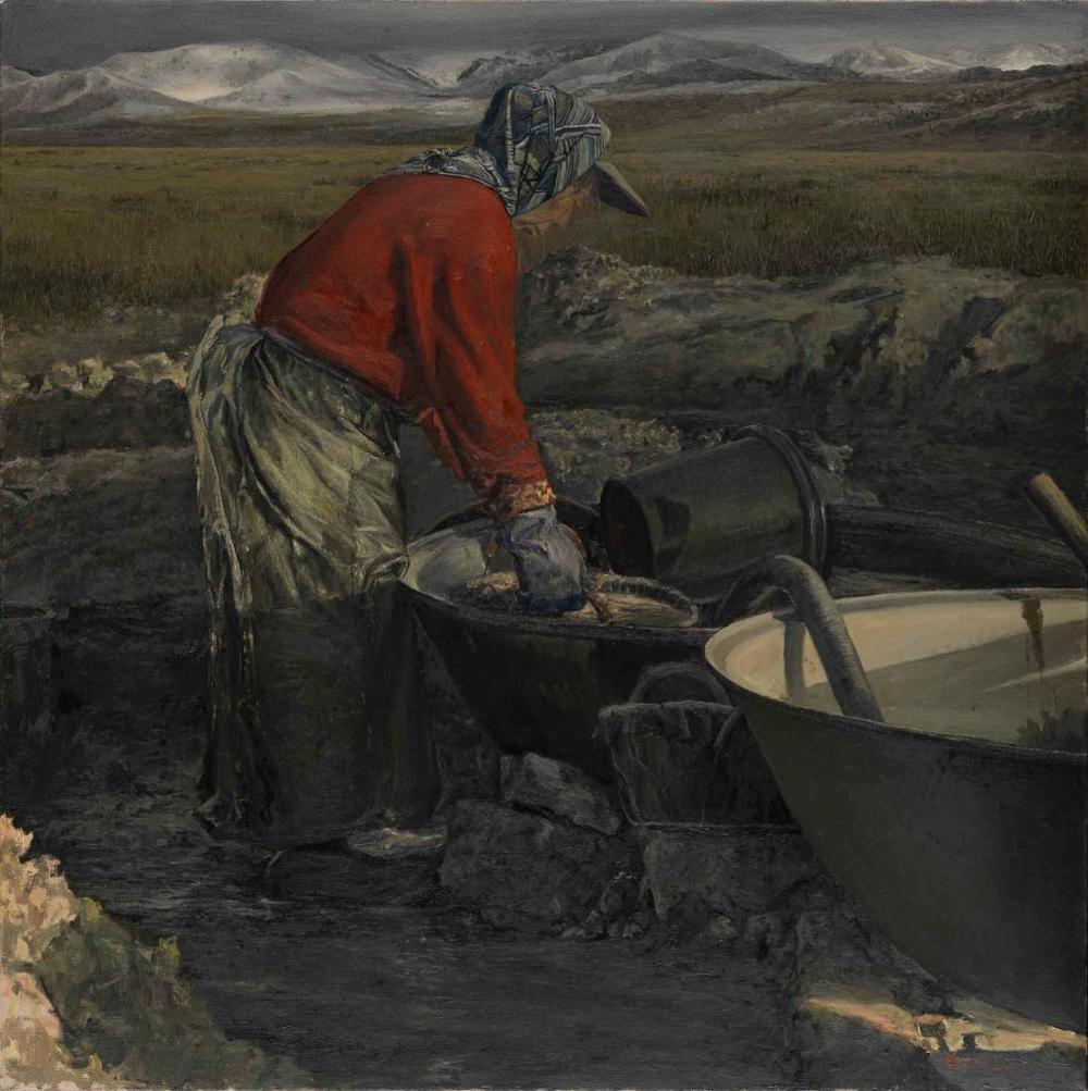 “乌金”与“淘客”,这两个怪诞称谓的组和,是画家顾天龙运用比喻修辞手法给自己系列新作的命名——“乌金淘客”诙谐而点睛。在这一系列新作中画家营造出颇具仪式感的气氛场景,同时与惯用的现实主义绘画技法相配合,赋予“煤”和“洗煤者”新的象征意义,令人耳目一新。顾天龙一项回避宏大叙事,而执着于对典型人物和典型场景的刻画,在借助具象绘画语言的同时也给作品笼罩上一层浪漫诗意。舒缓的画面节奏同深沉的绘画主题之间形成反差,然而恰恰是这种反差却成就了隶属于他个人的独特气质。较之顾天龙前期作品,“乌金淘客”更强化了对于细腻质感的把握,和对人物环境的塑造。经历长久的磨合,他的绘画主题与绘画语言之间已形成了微妙关系:二者互为表里,最终达到相辅相成。观看者能跟随画家预先设定的节奏,被缓缓引入情境之中,那里人物如同风景一样宁静深远,在一切归于平和的气氛里顾天龙开始了他的叙事:北方,旷野,煤与杂质的混合,洗煤者搅拌挥舞的手臂,浓黑煤浆盘踞成漩涡飞溅在他们身上,顺着反光胶皮围裙往下流淌。洗煤者静静的背对我们,俯瞰脚下了煤堆,慢慢缩短的烟蒂将燃到手指,此时此刻悲悯的情绪化为沉默幽闭的煤山,渴望灿烂涅槃得以置换新生。“淘客”静立在浓黑之中,双手提起盛满煤浆的容器,浓黑煤浆从容器裂缝汹涌渗出,哗哗的声音灌进我们的耳郭,变成一口深井。 顾天龙让这一切都包裹在茫茫黑色之中,黑色的力量足够支撑起整个画面的开始与延续。历经岁月,沉默和等待,大地孕育出黑色宝藏,尚未开启文明之火的远古年代,这一切被早早安排并发生了......“乌金”和“淘客”不期而遇,只为等待“收割”之日。与其称为“收割”,不如形容为一场“分娩”!“淘客”把“乌金”剥离了大地母亲的肉身,一寸寸洗净,踢去杂质,它们黑漆漆泛着亮光被从新堆砌于天日。前世苍绿茂盛历经了无数次的轮回转世,变得面目全非,无人再能认得出它们早先的模样。如今,它们携带难以掩盖的烈火秉性,被“淘客”牵回久违的世界,一场大地与时间蓄意催化的“彻底愤怒”烙印在它们的宿命。顾天龙画笔之下人物和场景体验孤独后仿佛就要脱离时代的境遇,继续秉承着他们神秘的仪式。“淘客”作为“乌金”的传递者心中明了这一切的因果,那手中的黑色之物是前世沃土凋零的躯干,远古大地蜕变的皮壳;是蕴藏炙热烈焰转世的还魂,也是存放洗煤者憧憬欲望的枷锁......面对着茫茫的一片“淘客”沉默,彻底燃烧是它们穿越悠悠岁月的归宿之所,只等待那一刻的降临它们喷出刺目的火焰,烧红了大地的根基...... 顾天龙在精妙塑造作品的同时,也为作品注入诗歌般的情怀,借以抒情笔意向观者传达自我精神的诉求。依旧的人文的关怀根植于整个创作活动的始终,而对题材的选取和把握无疑也是顾天龙智慧所在。“乌金淘客”系列作品的出现,可谓是当下生活作用于画家身心而后内化的产物,呈现出了人与客观世界之间相互映照与折射,最终并以寓言性的仪式感得以收尾。貌似宁静的画面安排之中,潜伏着沉甸甸的重量。顾天龙成功把握古典气质并挪用于当下叙事之中,给予观者提供贯穿上下文的视觉经验,他将作品在观看者面前铺展开来,更深层次的情绪被画家肢解后渗透在每一块笔触之间,这样一来由画家蓄意营造出的表里层次就直接触碰到了观看者的内心深处。乌金淘客 ——煤与洗煤者(文:李凯) “乌金”与“淘客”,这两个怪诞称谓的组和,是画家顾天龙运用比喻修辞手法给自己系列新作的命名——“乌金淘客”诙谐而点睛。在这一系列新作中画家营造出颇具仪式感的气氛场景,同时与惯用的现实主义绘画技法相配合,赋予“煤”和“洗煤者”新的象征意义,令人耳目一新。顾天龙一项回避宏大叙事,而执着于对典型人物和典型场景的刻画,在借助具象绘画语言的同时也给作品笼罩上一层浪漫诗意。舒缓的画面节奏同深沉的绘画主题之间形成反差,然而恰恰是这种反差却成就了隶属于他个人的独特气质。较之顾天龙前期作品,“乌金淘客”更强化了对于细腻质感的把握,和对人物环境的塑造。经历长久的磨合,他的绘画主题与绘画语言之间已形成了微妙关系:二者互为表里,最终达到相辅相成。观看者能跟随画家预先设定的节奏,被缓缓引入情境之中,那里人物如同风景一样宁静深远,在一切归于平和的气氛里顾天龙开始了他的叙事:北方,旷野,煤与杂质的混合,洗煤者搅拌挥舞的手臂,浓黑煤浆盘踞成漩涡飞溅在他们身上,顺着反光胶皮围裙往下流淌。洗煤者静静的背对我们,俯瞰脚下了煤堆,慢慢缩短的烟蒂将燃到手指,此时此刻悲悯的情绪化为沉默幽闭的煤山,渴望灿烂涅槃得以置换新生。“淘客”静立在浓黑之中,双手提起盛满煤浆的容器,浓黑煤浆从容器裂缝汹涌渗出,哗哗的声音灌进我们的耳郭,变成一口深井。 顾天龙让这一切都包裹在茫茫黑色之中,黑色的力量足够支撑起整个画面的开始与延续。历经岁月,沉默和等待,大地孕育出黑色宝藏,尚未开启文明之火的远古年代,这一切被早早安排并发生了......“乌金”和“淘客”不期而遇,只为等待“收割”之日。与其称为“收割”,不如形容为一场“分娩”!“淘客”把“乌金”剥离了大地母亲的肉身,一寸寸洗净,踢去杂质,它们黑漆漆泛着亮光被从新堆砌于天日